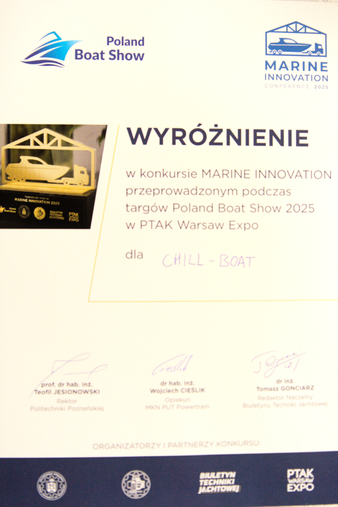 Katamaran elektryczny Chill-Boat Trio zajął pierwsze miejsce w kategorii innowacje podczas VII Mazurskich Targów Sportów Wodnych Giżycko 2014.